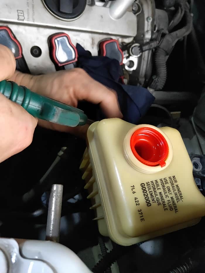 打开发动机盖时发现方向助力泵有点响声,想想方向助力油没换过,一动想法就停不下,继续换