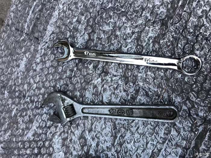 精心准备的加油口扳手,结果不对,哈哈,只好活动扳手来凑合,此时已经拔开电线比划了套筒并不能用,套不到底
