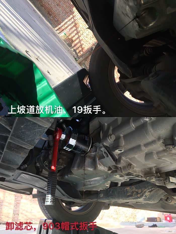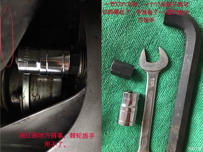 保养完后装护板前看了下变速箱加油和放油口,准备了些板子,下次换变速箱油用,提前做好功课,加机油口简单普通17板子就可以卸了,放油口不行,碍事的,找了节17六方搭配呆板子可以卸。