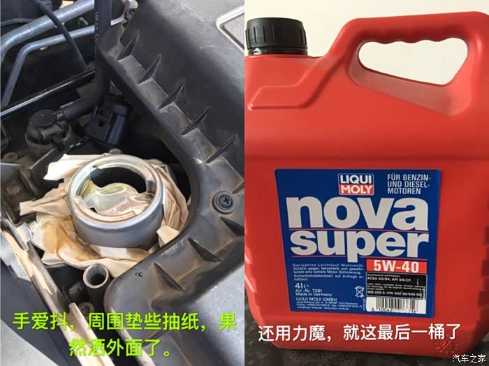 一桶直接往进倒,剩大概不到半升的样子,机油尺也不看,差不多,现在换机油比以前粗心了,没以前那么细致小心翼翼的了。