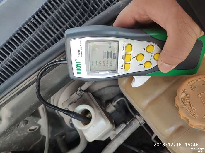 自己买的刹车油含水性检测仪,一般来说北方地区3年4万公里,南方地区2年4万公里更换,但是我每次用这个检查,还是比较直观的。看到检测仪显示1.5%还是OK的,但是感觉时间太长了,还是换了吧