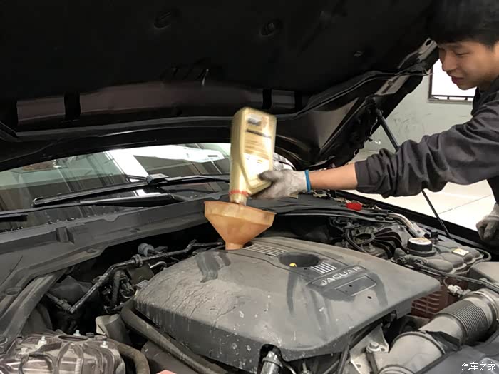 6升嘉实多的机油,瓶身是有捷豹logo的,路虎的是有路虎logo的,检查过原厂机油才比较放心,再也不想挑战发动机缸体的极限了…