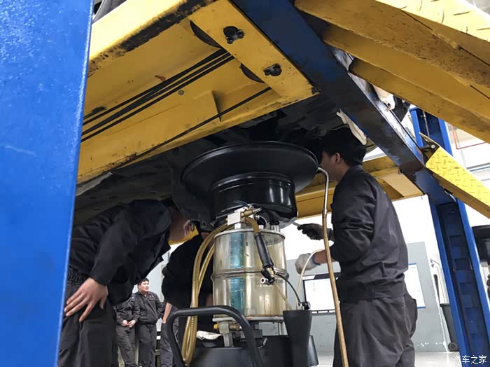进车间看看,机油已经抽完了,机滤也都换完了,师傅在检查紧固螺丝之类的