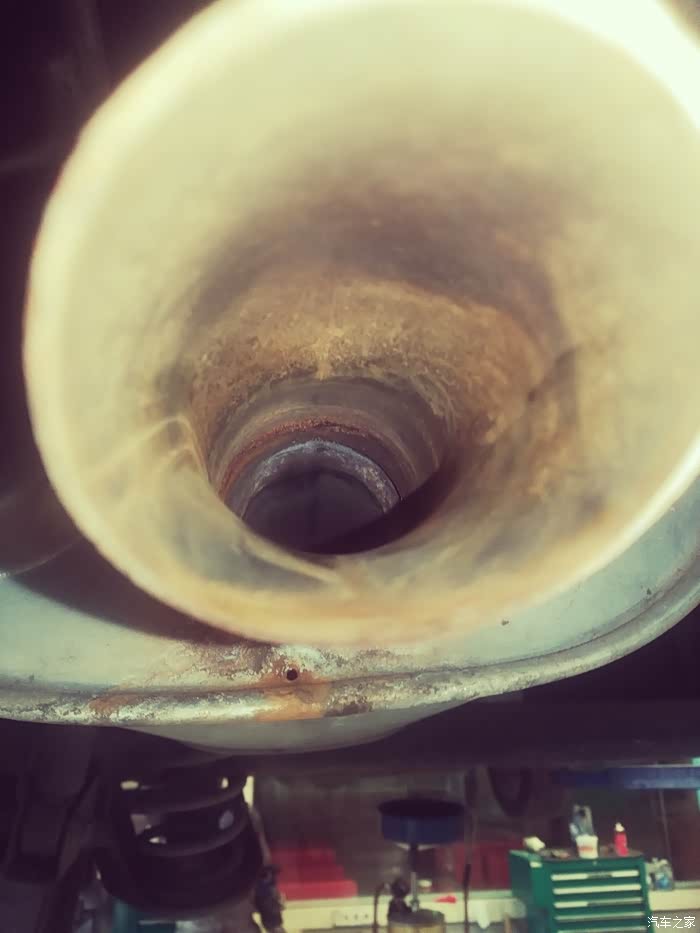 检查下排气管,积碳呢?只见厚厚的锈。