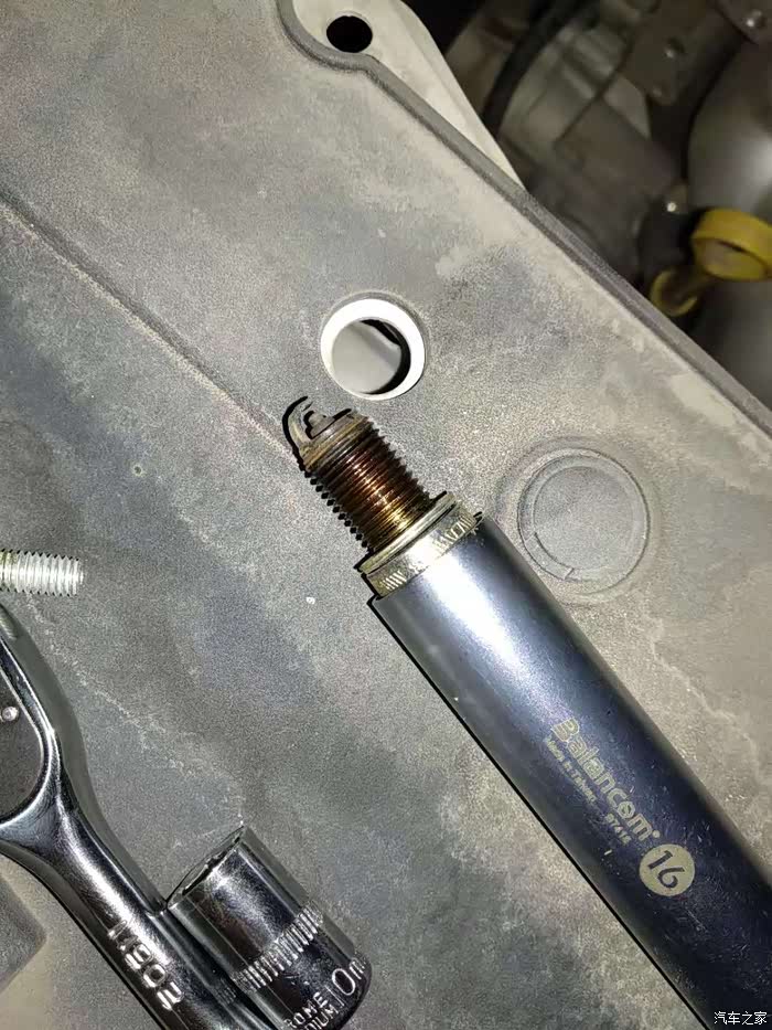 这里使用的火花塞专用磁性套筒,可以看到火花塞上积碳还是很多,朋友这个车从来没有清理过积碳,可想而知,燃烧室里面积碳更多,其次火花塞明显磨损,应该及时更换,建议超过4万公里的车都应该检查火花塞,以及更换
