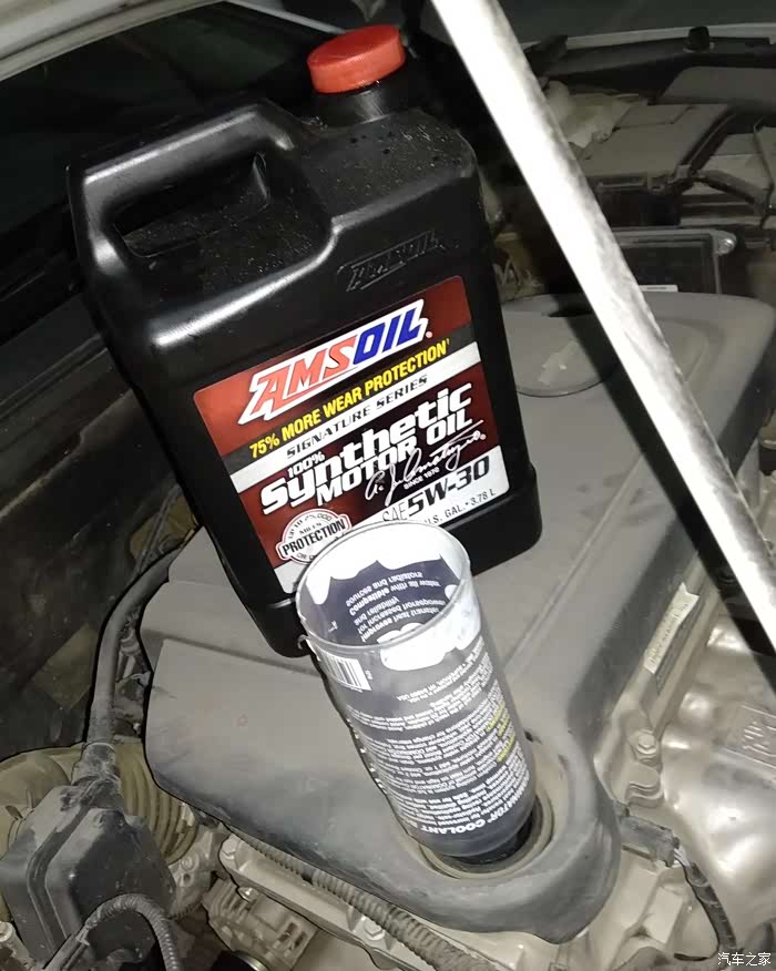 等油底壳放油比较彻底之后安装好油底壳螺丝和新的机滤,这里没有拍照了,安装机滤记得一定使用手而不要用扳手,其次要在新机滤上涂抹一圈新的机油,安装细节可以看我之前的帖子。用自制的漏斗添加新的机油,一边添加,一边检查机油尺,当机油量在机油尺中线时为最佳,最后剩下约0.5QT的机油量,这个大瓶是4QT约合4L不到