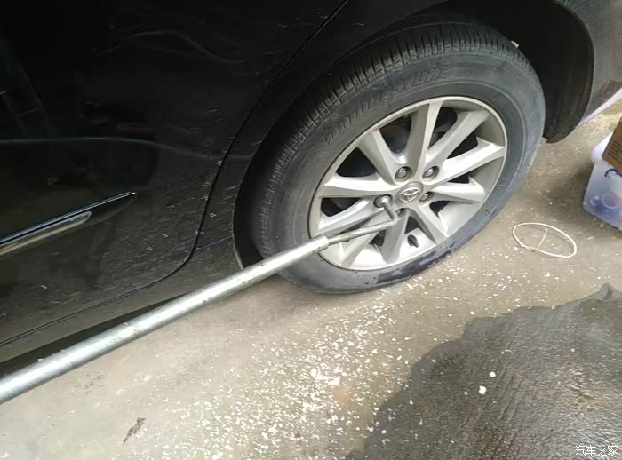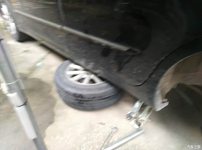 拧松轮毂螺丝(用水管加长力臂,杠杆原理)后再抬升千斤顶。