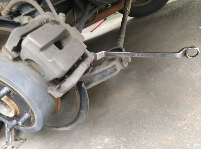 用14号梅花(不主张用开口,开口容易导致螺丝彼锋(摩损))拆下两颗卡钳螺丝。卡钳用电线挂好,防止损坏油管(网上学的哟)