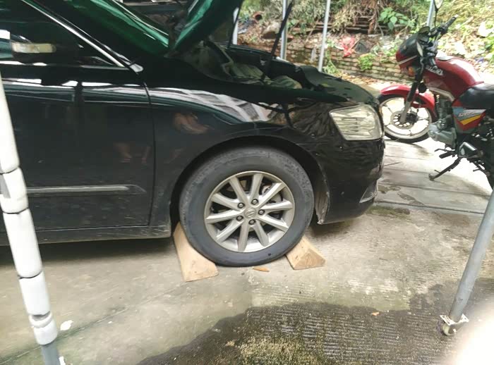 万事俱备,只等刹车片到期。前刹车片还很厚,今次就只换后刹车片。停好车,做好止动措施。