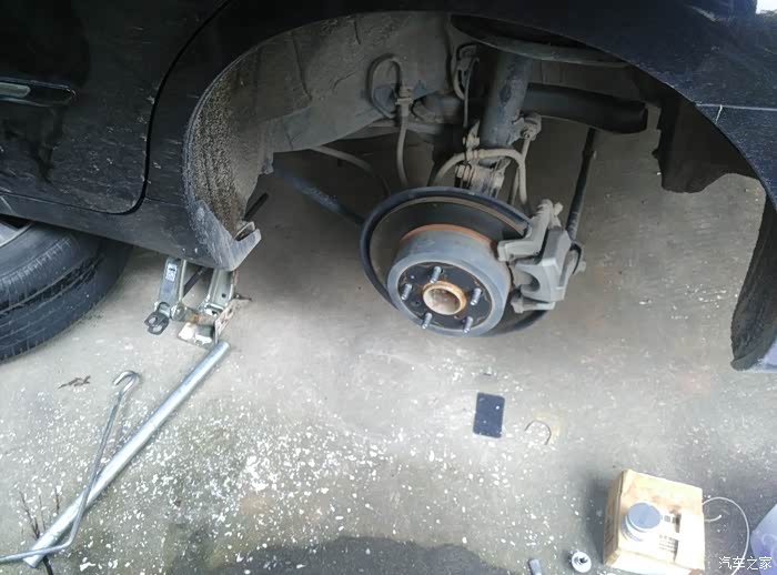 装回卡钳,拧紧两颗卡钳螺丝,装回轮毂,拧个半紧轮毂螺丝,最后卸下千斤顶后,让轮胎着地,再拧个全紧螺丝。两个轮胎都装好后记得踩几脚刹车,让刹车活塞到位。最后,盖回刹车油壶盖。试车,0K.
