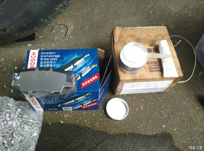 刹车片卡位及导轨清洁后涂适量消声膏,软管装的为消声膏,圆瓶装的导销润滑膏。然后安装好(内刹车片因视线问题要慢慢安装)。