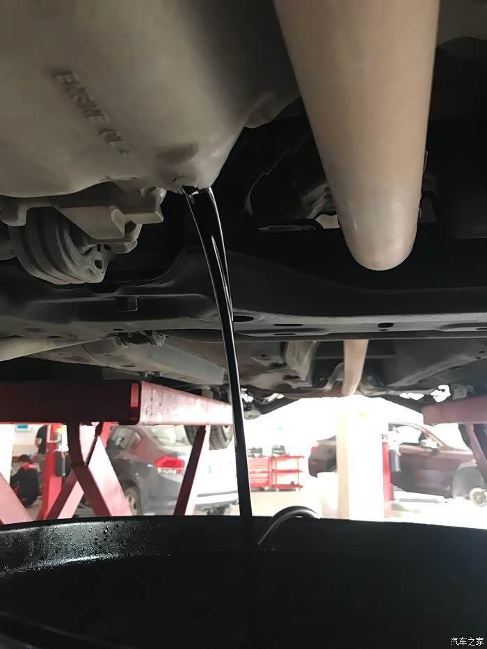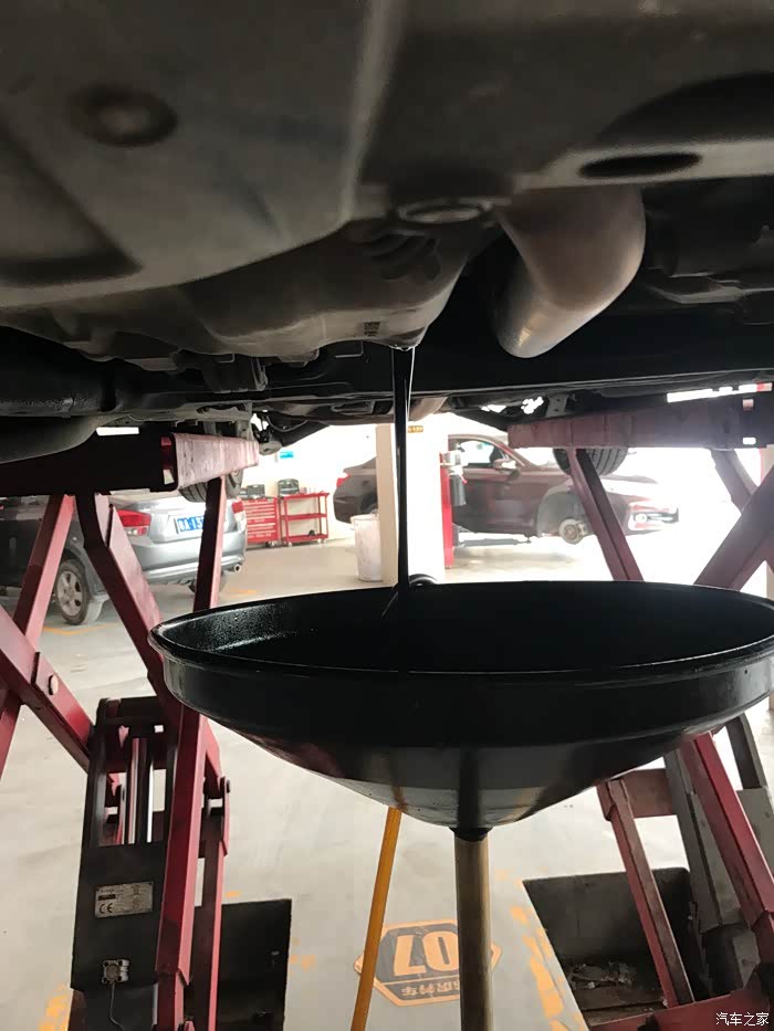 工作人员先把机油盖打开,然后再抬起车子。放油底壳螺丝,然后把地盘检查了一遍