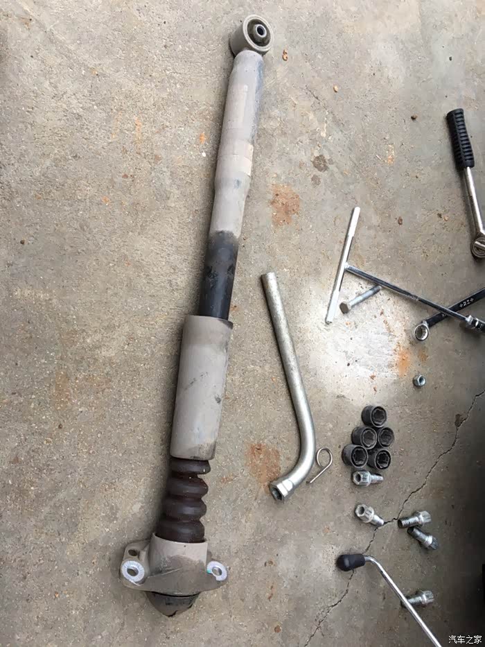 发挥咱特长DIY一套工具,买两个T型16的套筒扳手,一个拆减震器螺丝用一个做工具,T型最前和套筒连接处那切掉,断面打孔12mm,连杆处销子退掉,取下17的装上16的,复位销子,过程很啰嗦,大家看图理解