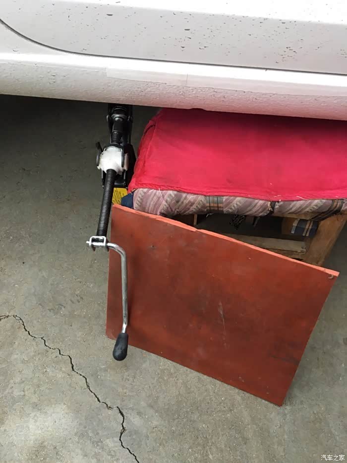 把千斤顶去掉换上板凳,千斤顶一会儿要用。板凳上面放块皮子,别把凳子压坏了,放凳子时注意别压着车底下的一些管子什么的。