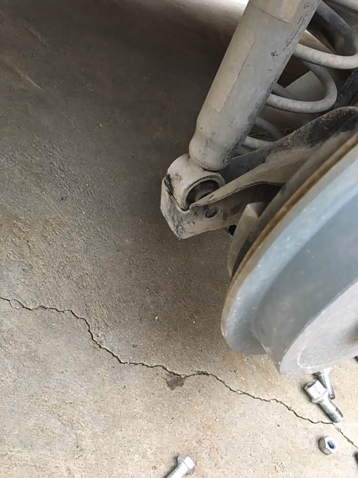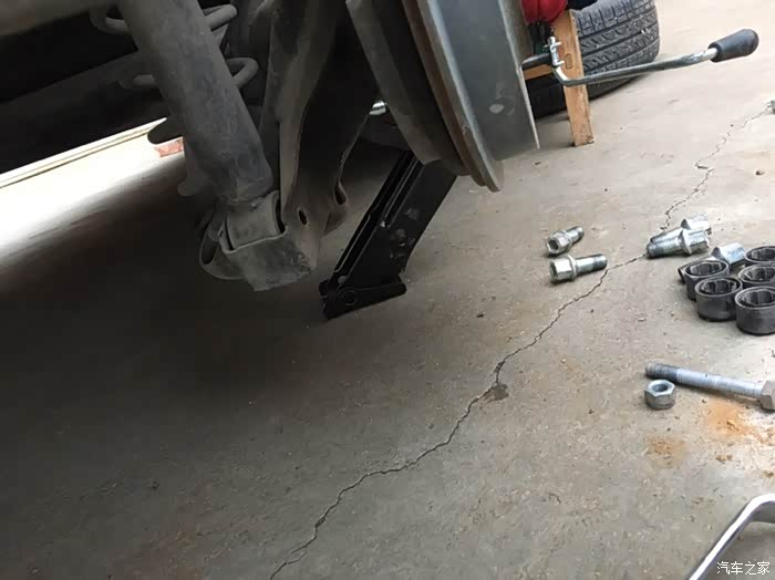 装好之后准备装车,原路返回的装。用千斤顶顶下摆臂对螺栓孔,穿螺栓,上下螺丝都先带着别拧紧,统一交叉着上,和装轮毂螺丝一个道理,防止没装到位。