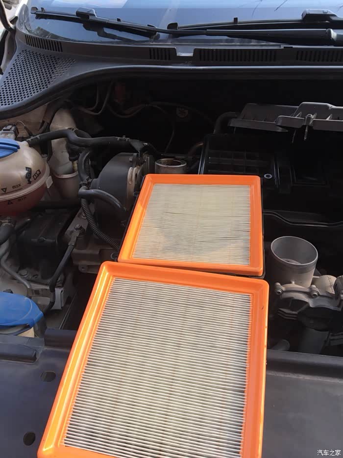 盖子拿开后看到的旧空滤也不是很脏,再看新旧对比一下,其实没区别,新的也是五千公里拆下来吹了吹的,打算在用五千公里。