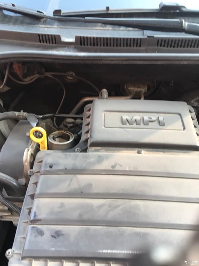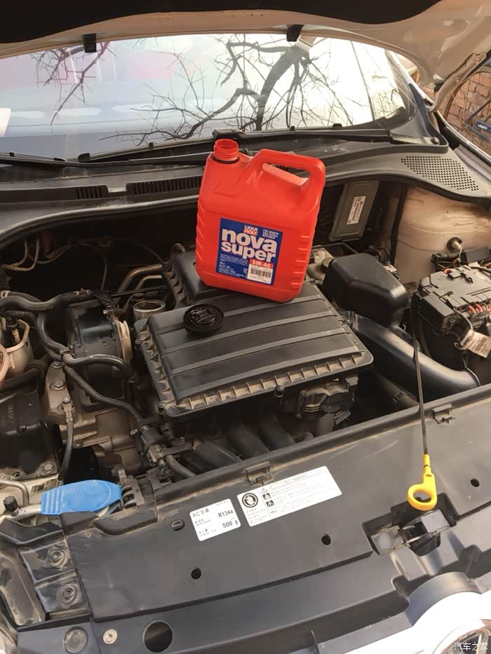 车子放下来,熄火五分钟,看机油尺,加机油到中线,还剩大概300毫升机油。