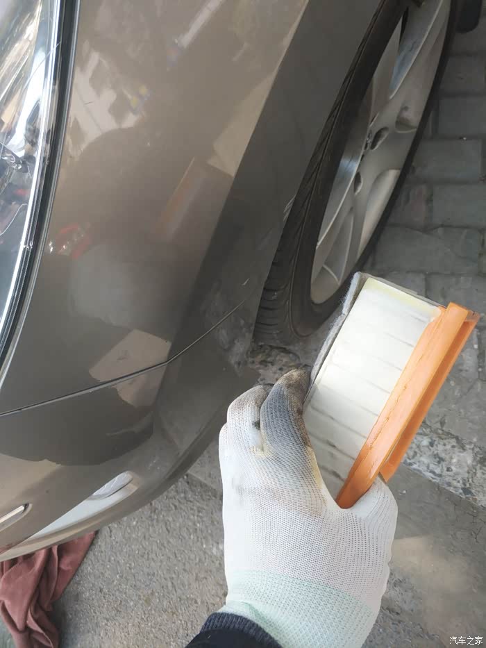 就这样拿在手里,对着轮胎拍几下。千万不要用空气泵吹。那些4s店的,对着这个空滤,用空气泵使劲的吹。