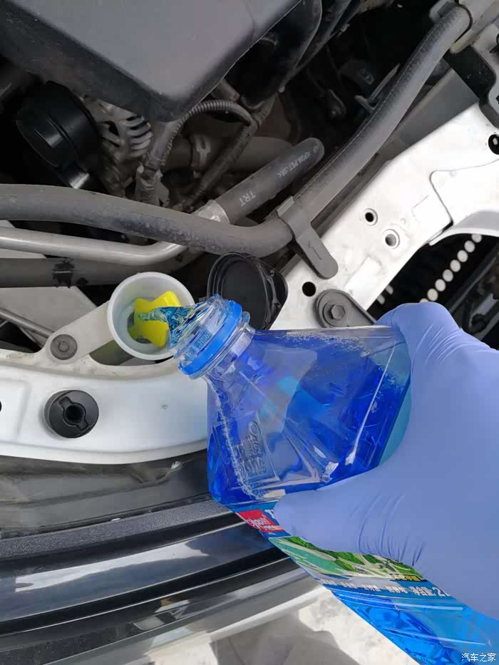 玻璃水加满。例行保养,春雨比较多。玻璃水用的飞快