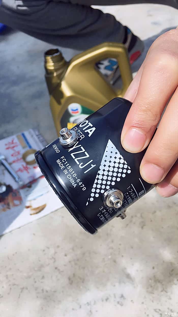 旧机滤是用手拧紧的。按照丰田的维修手册来说,这是错误的操作。应该用帽式滤器盖来上紧。后面会有图片说明。所幸的是手劲不小,没有漏油。大家最好按照标准操作来,各家滤芯不同,不要以偏概全。
