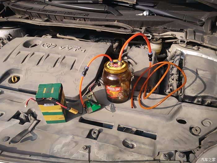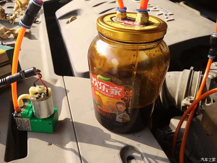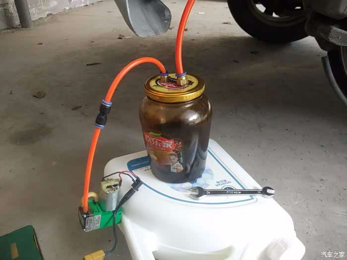 自制的抽油机,锂电组电瓶、真空泵、黄桃罐头、一些气动管件组成。