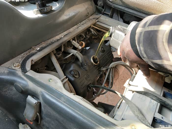 准备添加新机油,发动机盖渗油了,黑乎乎的