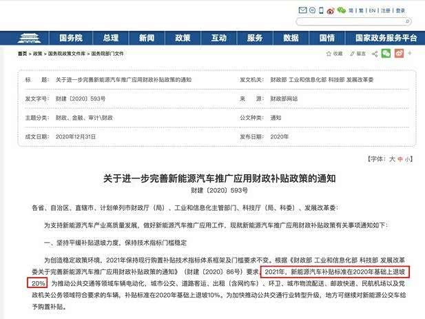 四部门:新能源汽车补贴标准在2020年基础上退坡20%