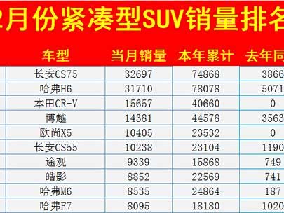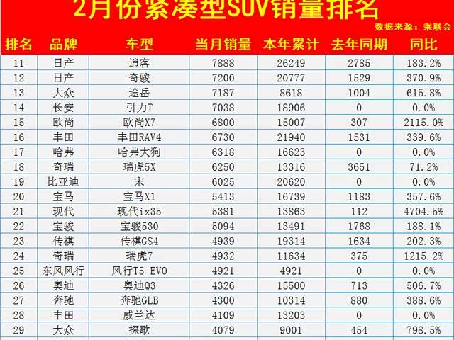 2月份紧凑型SUV销量排名(1-50名)出炉:仅6款破万,途观前十!