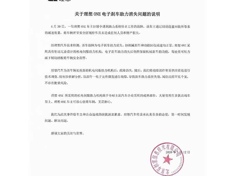 理想发布刹车助力失效说明:属个案不存批量风险!