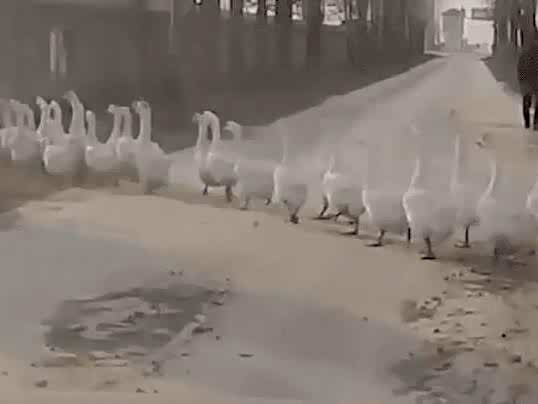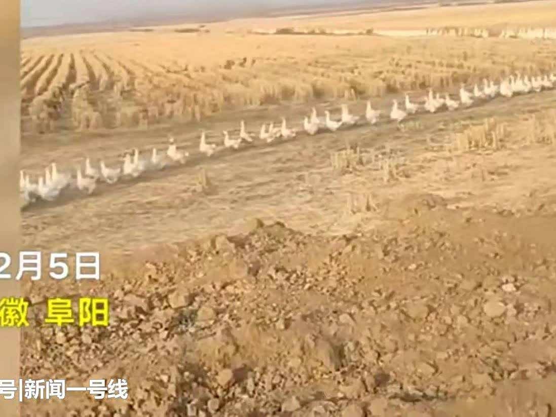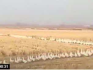 千米长大鹅方阵排队过马路,汽车等15分钟未过去!
