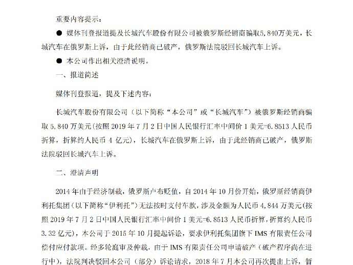 长城汽车被坑4亿!经销商破产,俄罗斯法院驳回上诉,耗时四年仍旧无果